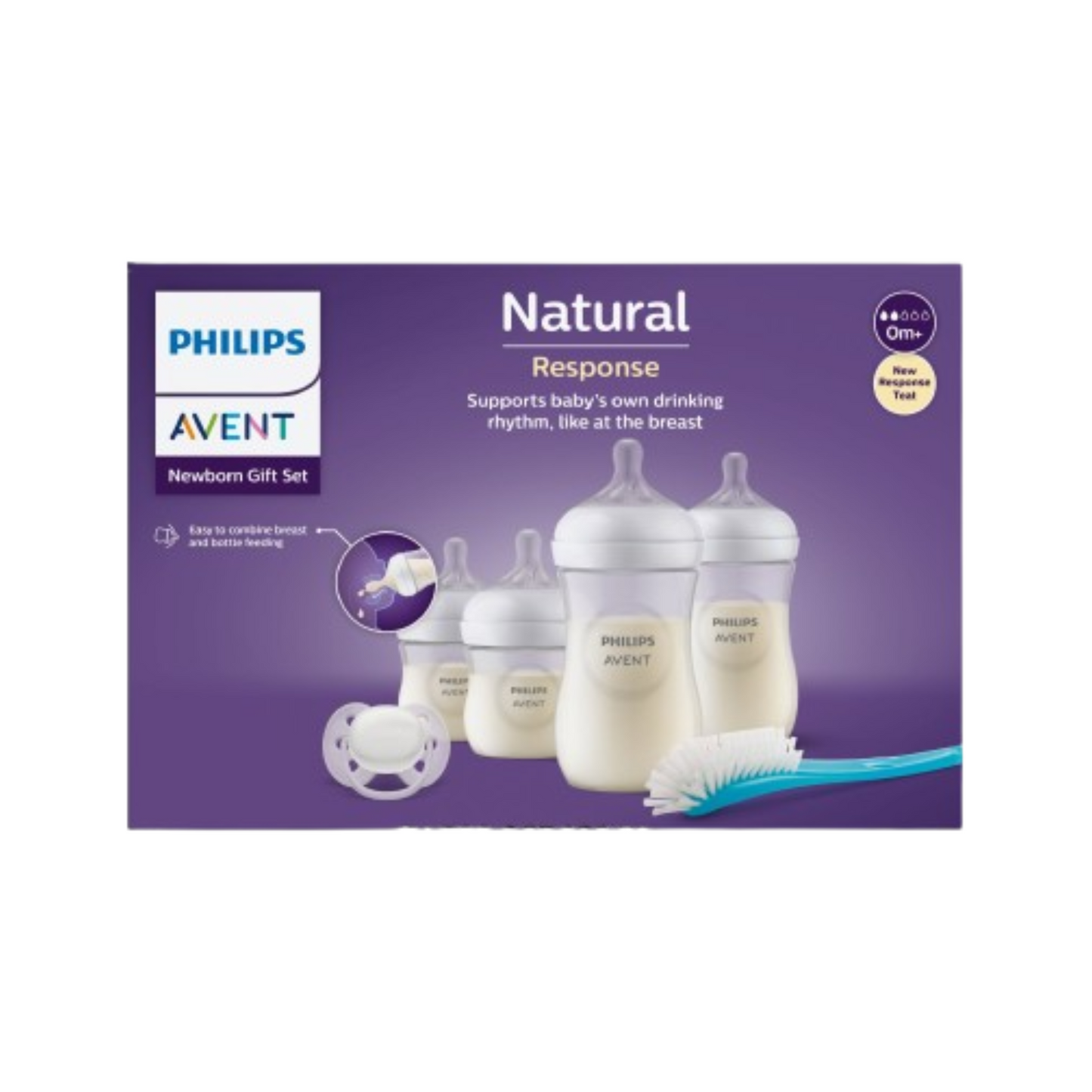 This newborn gift set includes the PHILIPS AVENT NATURAL 3.0 FEEDING NEWBORN GIFT SET WITH 4 BOTTLES, designed to make feeding time easier and more comfortable for both baby and parent. With a natural milk flow and anti-colic valve, this set promotes healthy feeding and reduces discomfort for baby.